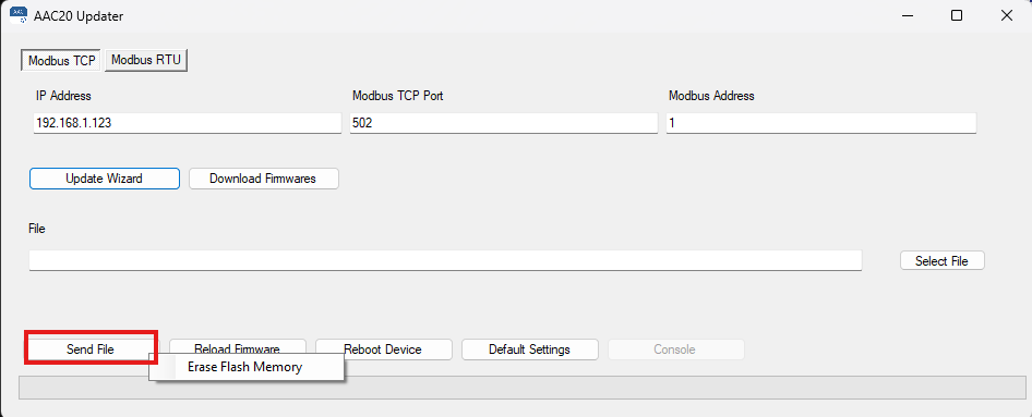 2. klicken sie mit der rechten Maustaste auf Send File → Erase Flash Memory und bestätigen sie