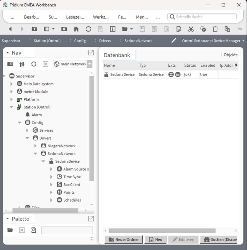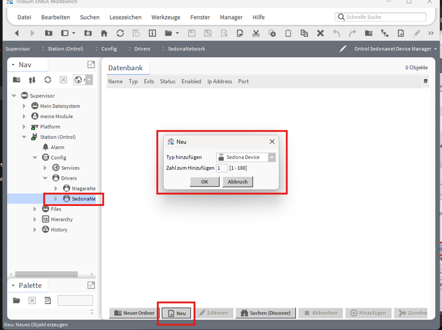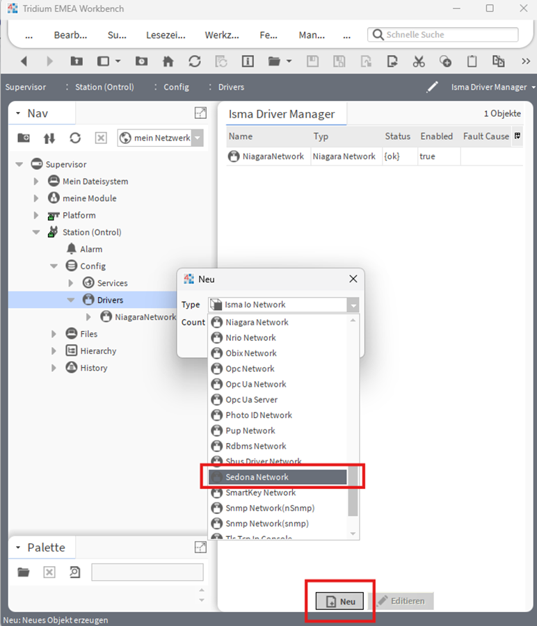 7. Navigiere zu Config->Drivers und füge ein neues Sedona Network hinzu.