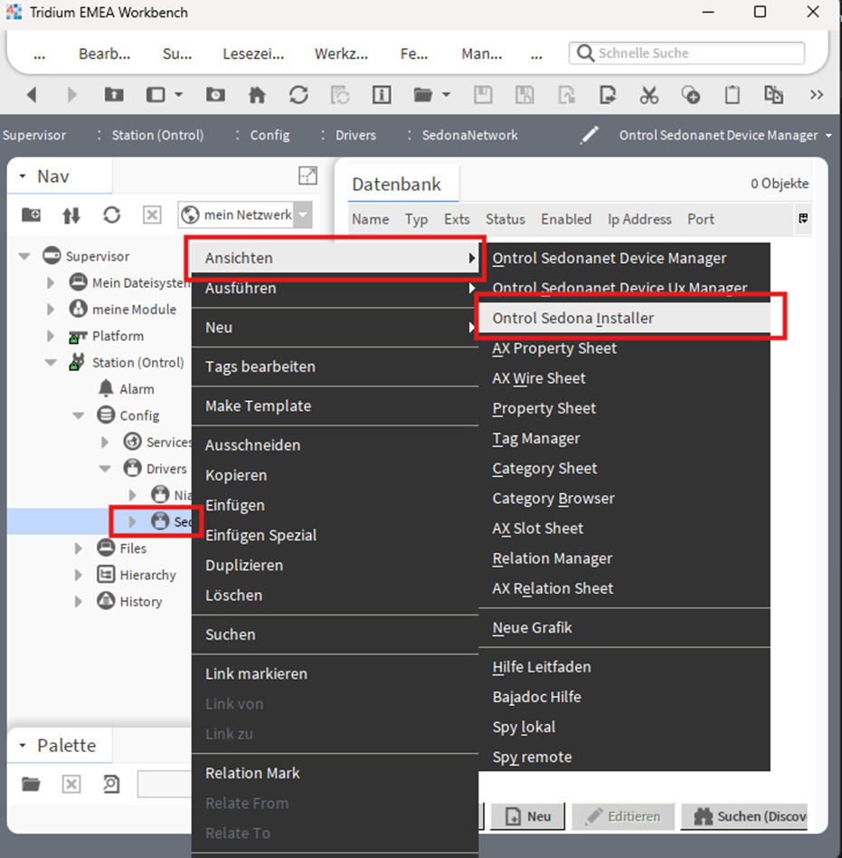 8. Klicke rechts auf das neu hinzugefügte Sedona Network und wechsle zur Ansicht Ontrol Sedona Installer.