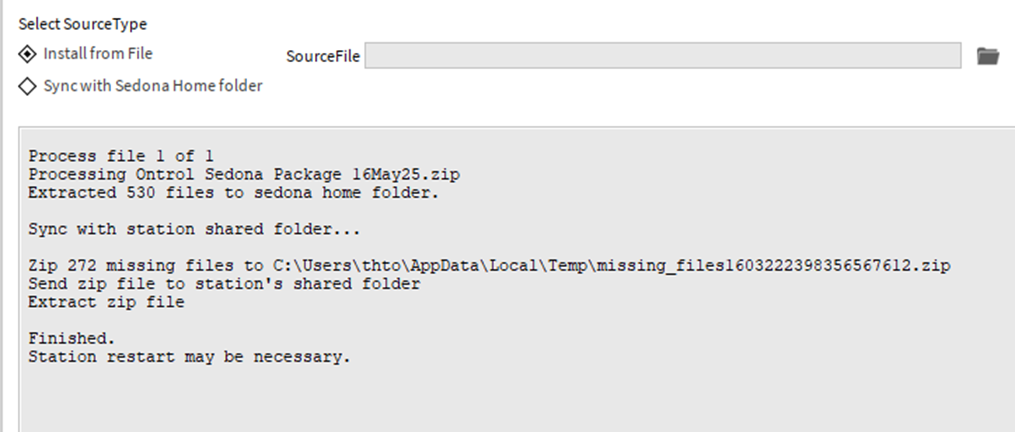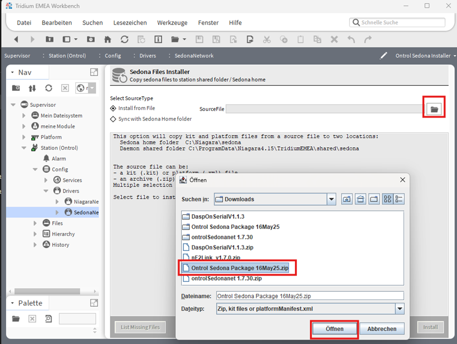 9. Öffne als Source File den heruntergeladene Ontrol Sedona Package um alle nötigen Daten in der Workbech aufzubereiten.