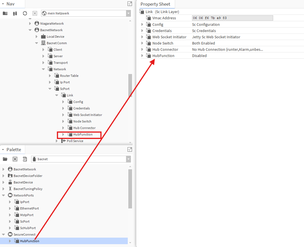 2. In der Palette unter NetworkPorts den ScHubPort in das bestehende Config->Drivers->BacnetNetwork->Bacnet Comm->Network hinzufügen.