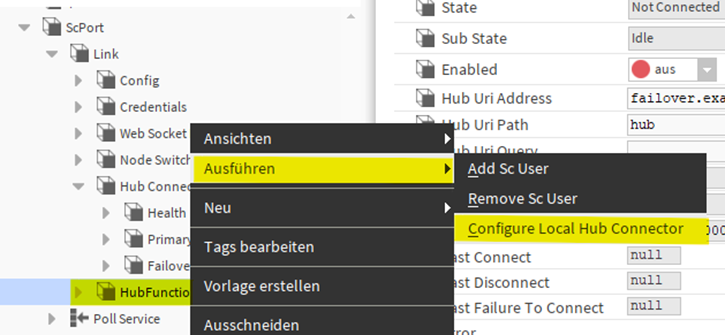 3. Klicke mit der rechten Maustaste auf die neu hinzugefügte HubFunction und wähle Ausführen-> Configure Local Hub Connector