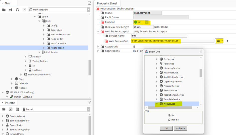 7. Klicke doppelt auf HubFunction und aktiviere ihn. Wähle als WebServiceOrd den Webservice.