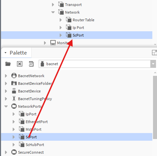 2. In der Palette unter NetworkPorts den ScPort in das bestehende Config->Drivers->BacnetNetwork->Bacnet Comm->Network hinzufügen.