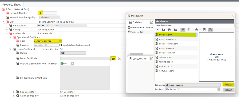 5. Unter ScPort->link->Credentials->Issuer Certificate1-> Issuer Certificate Ordner pfad öffnen und unter User Home->certManagement das ca Zertifikat öffnen.