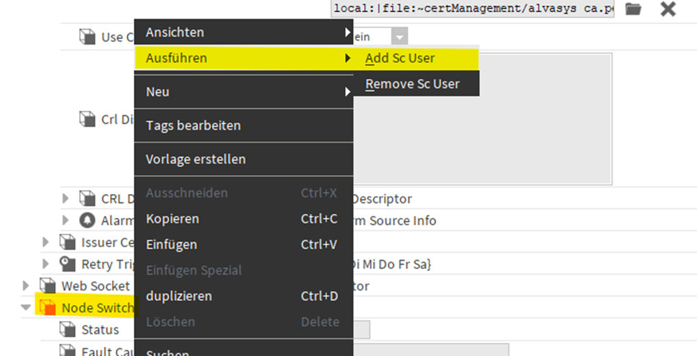 5. Klicke mit rechter Maustaste auf Node Switch und wähle Ausführen->Add Sc User.