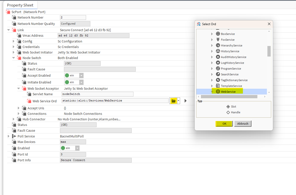 6. Wähle unter Web Socket Acceptor den WebService unter Services->WebServices.