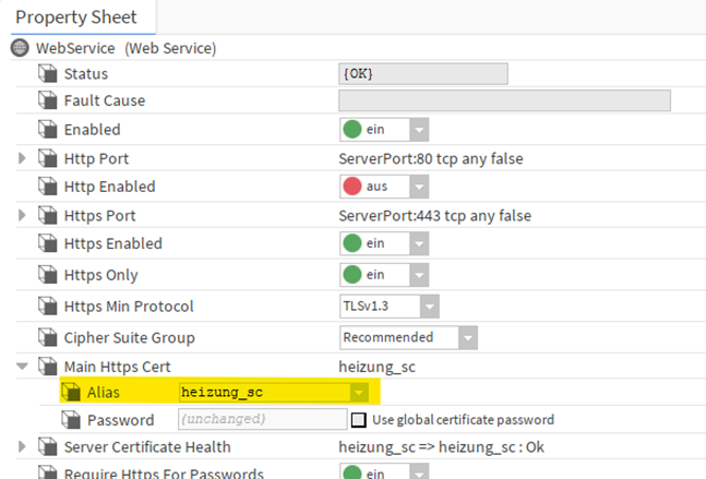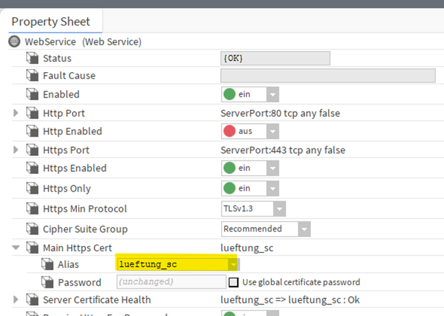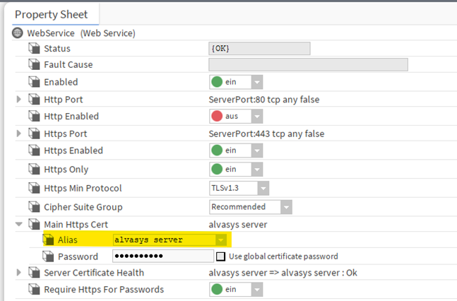 10. In services->WebService wechseln und unter Main Https Cert- Alias das neu hinzugefügte Server Zertifikat hinzufügen und Speichern.