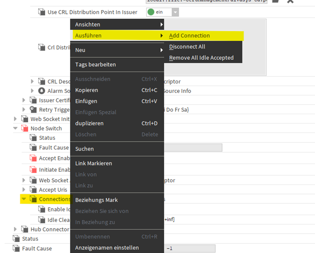 9. Klicke mit rechter Maustaste auf Connections unter Node Switch und wähle Ausführen->Add Connection.