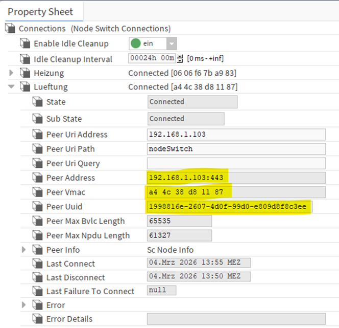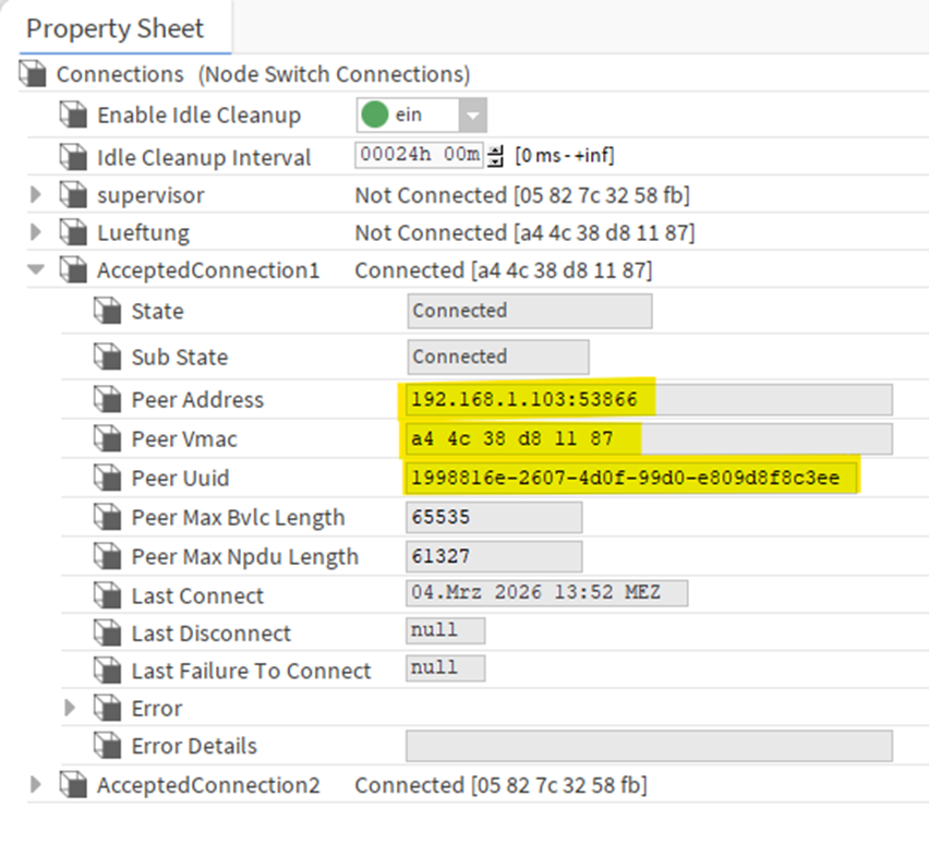 17. Auf der Gegenstelle sollte automatisch eine AcceptedConnection erzeugt werden mit der gleichen Peer Address, Vmac und uuid