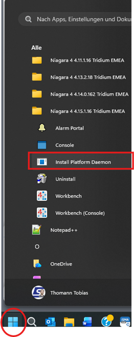 1. Öffne das Windows-Startmenü und starte den Install Platform Daemon.