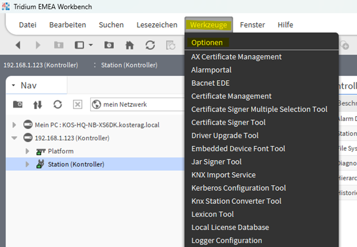 1. Sobald dein Rechner für die Workbench lizenziert ist und gestartet ist, Navigiere zu Werkzeuge-> Optionen.