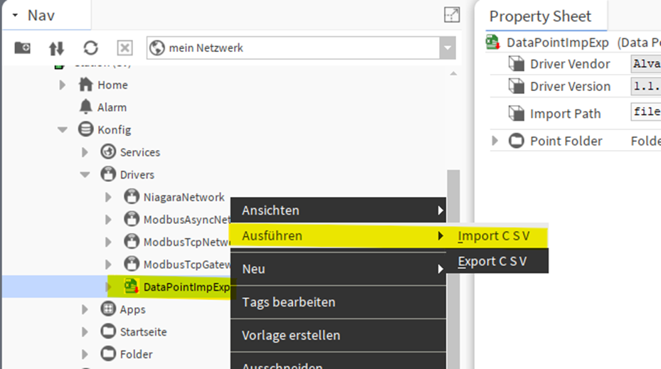 5. Klicke rechts auf DataPointImpExp und wähle Ausführen->Import C S V.