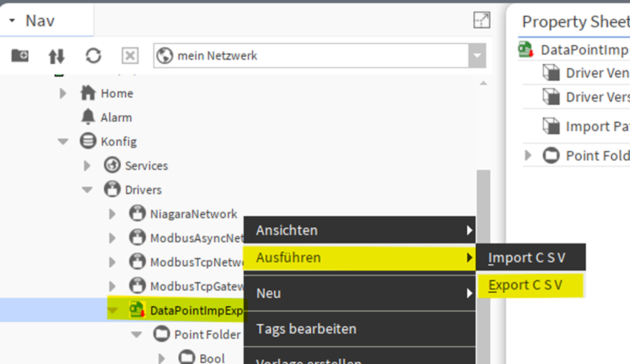 2. Klicke rechts auf den DataPointImpExp und wähle Ausführen->Export CSV.