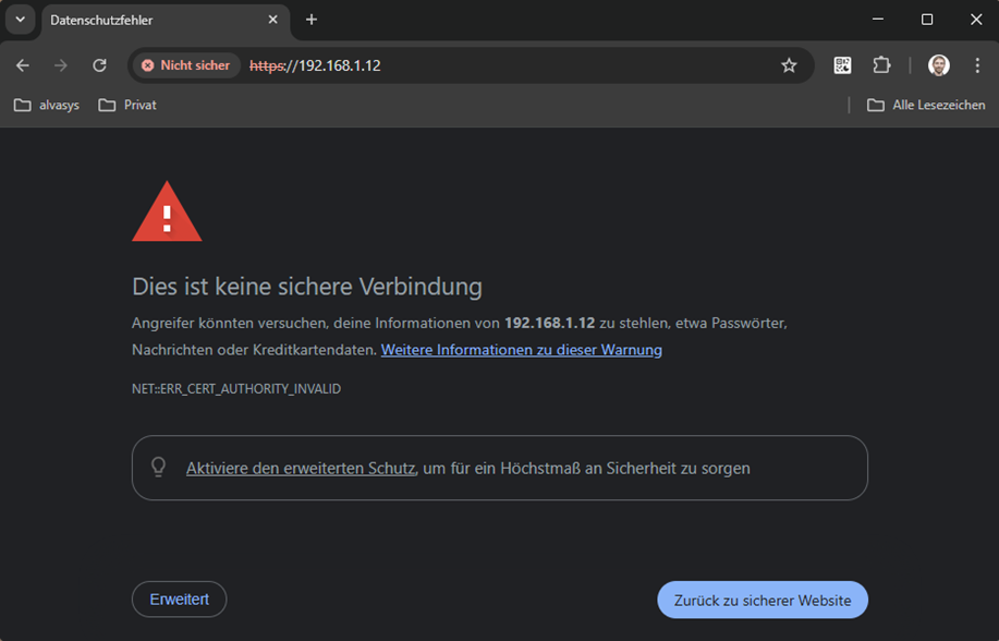 Beim Verbinden mit der Station über den Browser erscheint die Meldung «Dies ist keine sichere Verbindung».