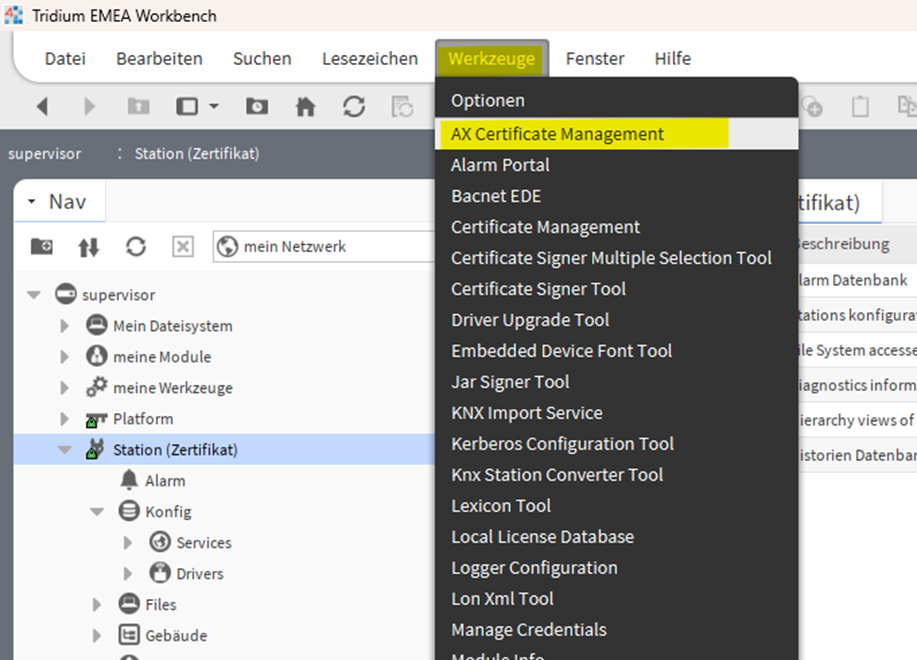 1. Öffne die Workbench und gehe zu Werkzeuge -> AX Certificate Management.
