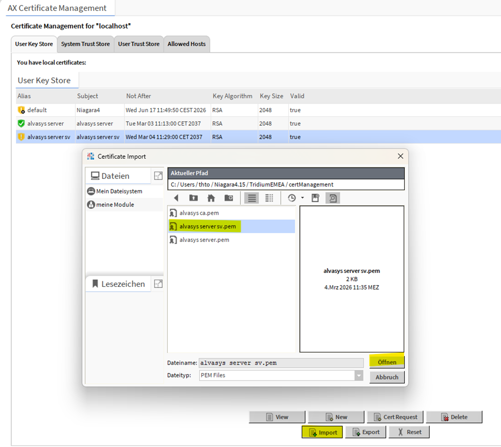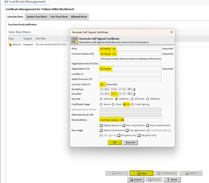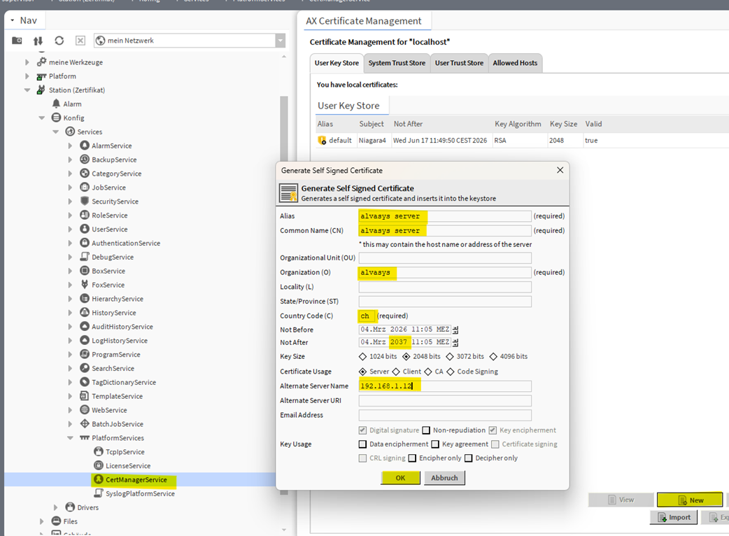 1. Öffne die Station in der Workbench und gehe zu Konfig->Services->PlatformServices->CertManagerService und erstelle ein neues Zertifikat.