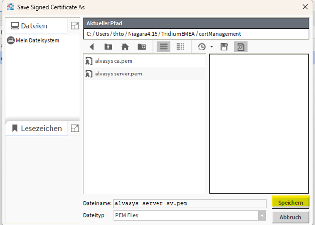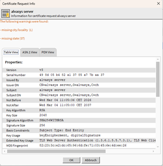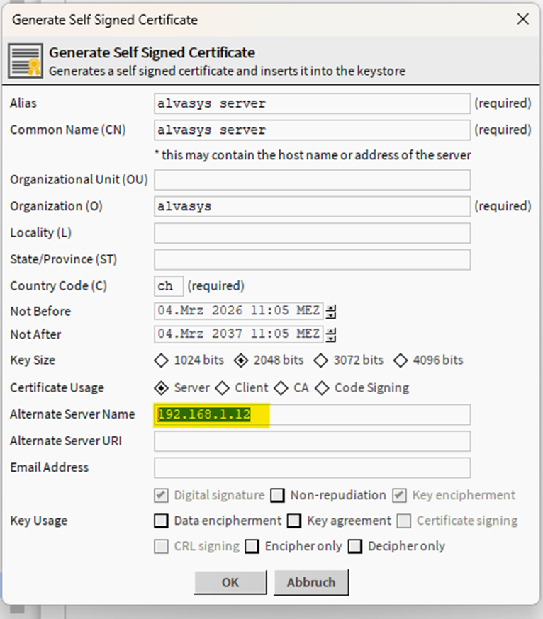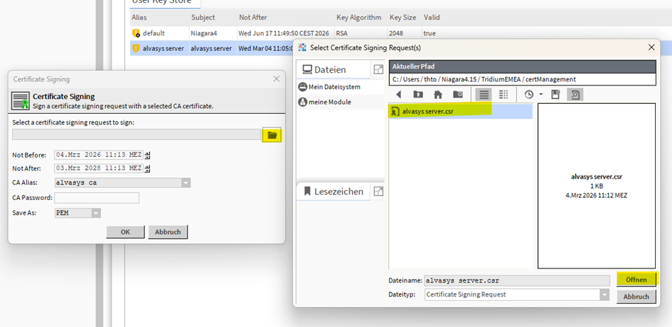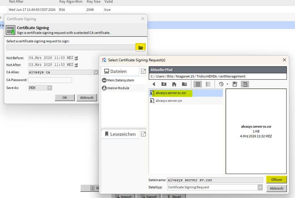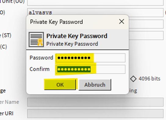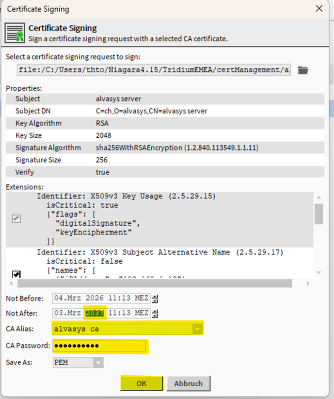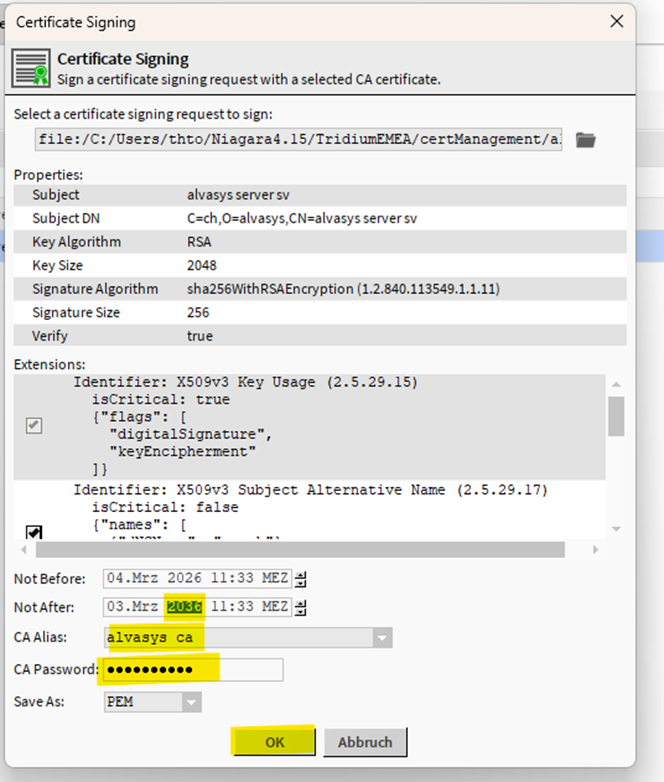 8. Mit dem alvasys ca signieren, Ablaufdatum eingeben und Passwort eintragen. Mit Ok bestätigen.