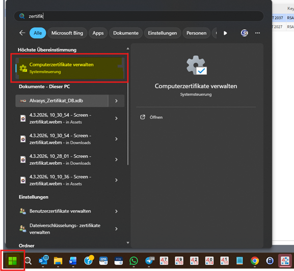 7. Starte über Windows Start oder mit Ausführen->certlm.msc den Computerzertifikate verwalten.