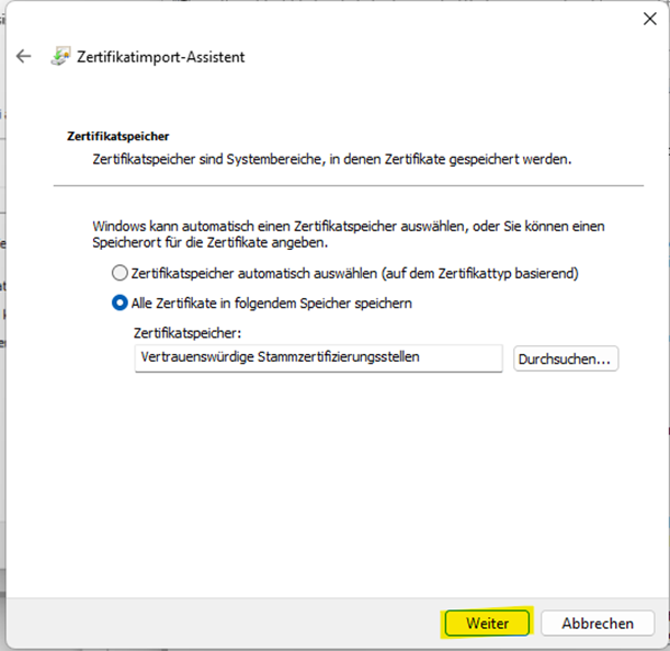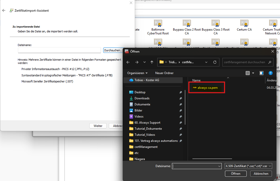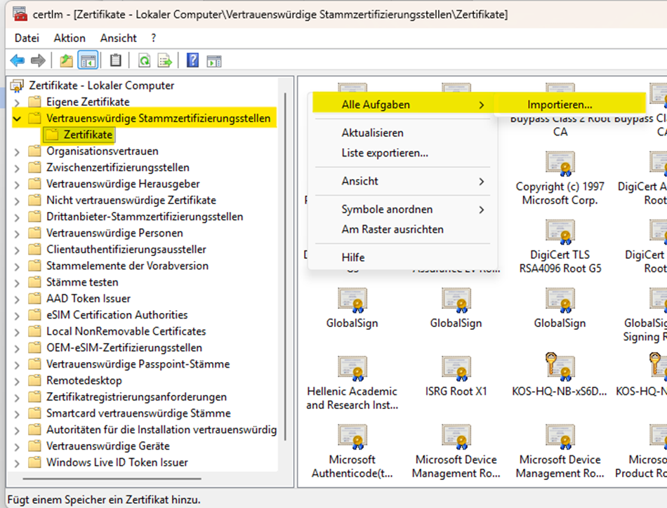 8. Öffne den Ordner Vertrauenswürdiger Stammzertifizierungsstellen->Zertifikate und klicke mit rechter Mauszeiger ins Verzeichnis und wähle Alle Aufgaben -> Importieren.