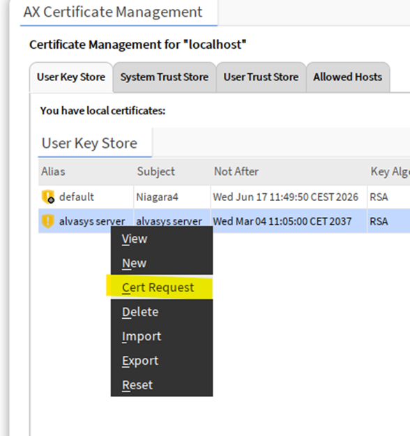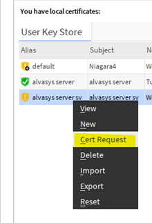 4. Klicke mit rechter Maustaste auf das Zertifikat und wähle Cert Request.