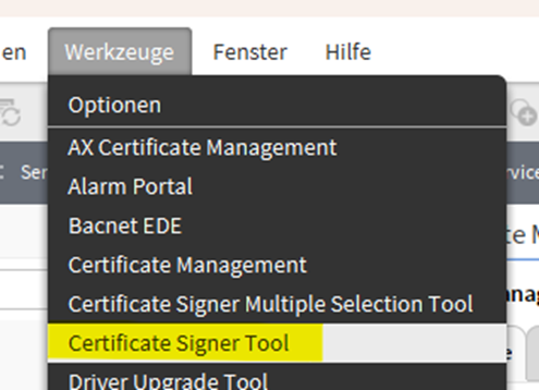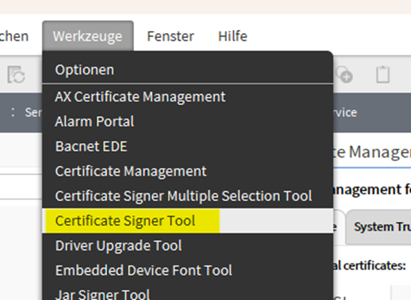 7. Öffne Werkzeuge -> Certificate Signer Tool.