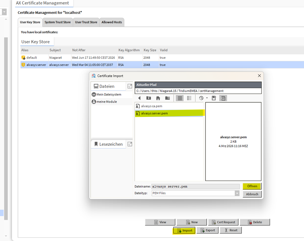 11. Zum Webservice wechseln und das neue Zertifikat im Main Https Cert öffnen. Passwort nicht vergessen!