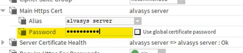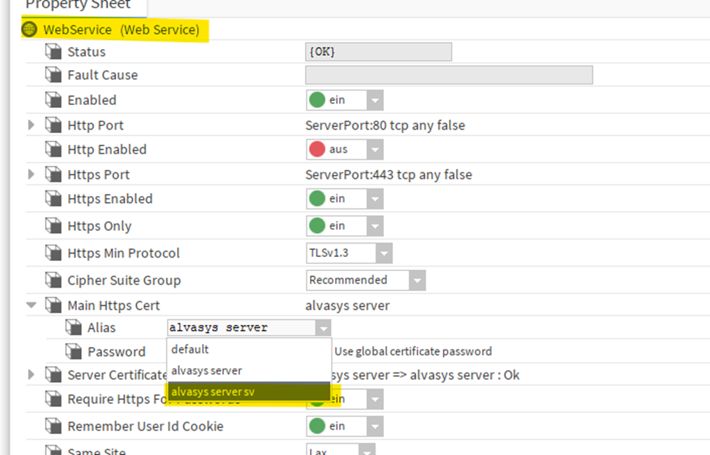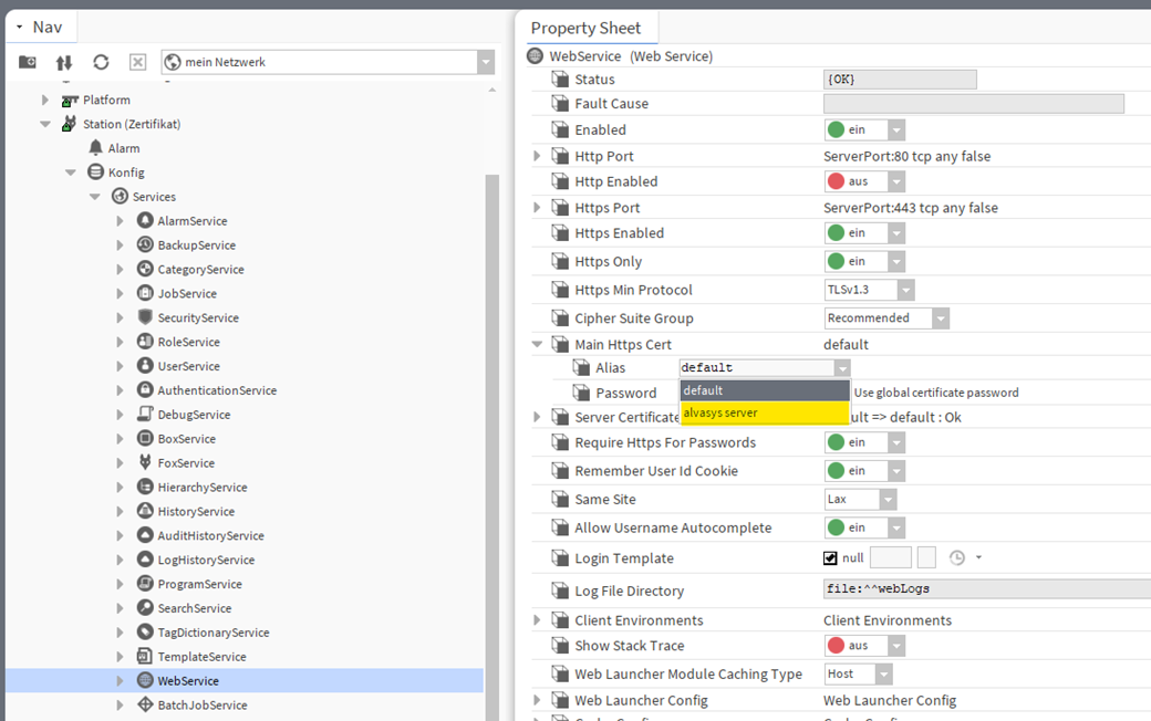 14. Navigiere zu Konfig->Services->WebService und ändere den pfad des Main Https Cert auf das Server Zertifikat alvasys server.