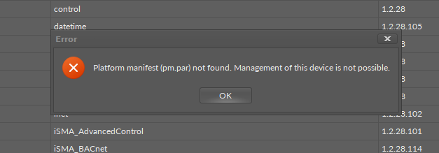 Beim Starten des Kit Managers im iSMA-Tool, erscheint die Fehlermeldung: Platform manifest (pm.par) not found. Management of this device is not possible auf.