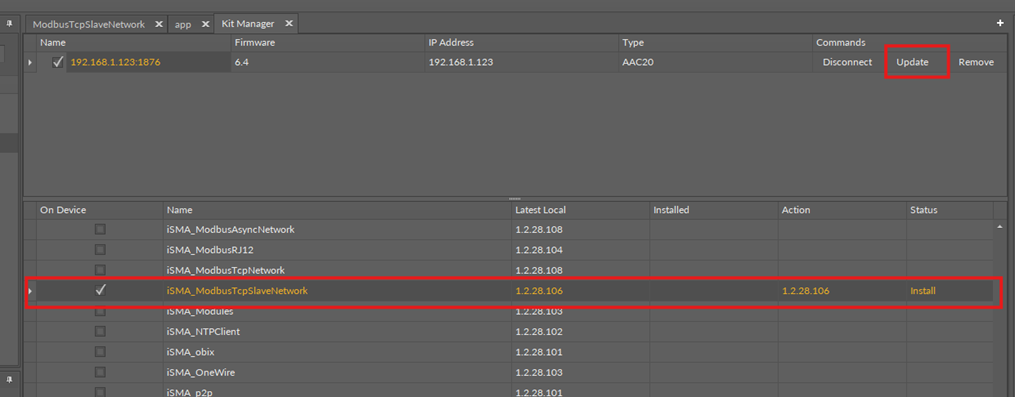 3. Kreuze den iSMA_ModbusTcpSlaveNetwork an und führe ein Update des Kontrollers aus.