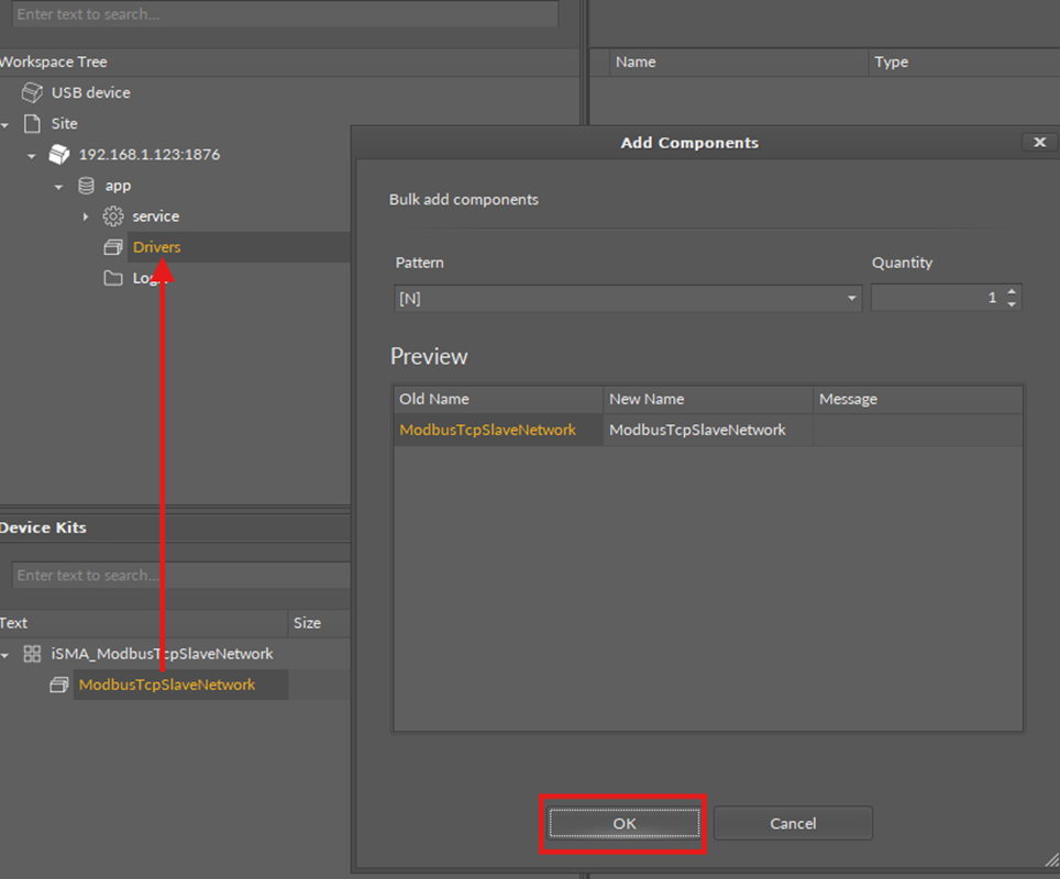 5. Wechsle zu app->Drivers und füge den ModbusTcpSlaveNetwork hinzu. Bestätige mit OK.