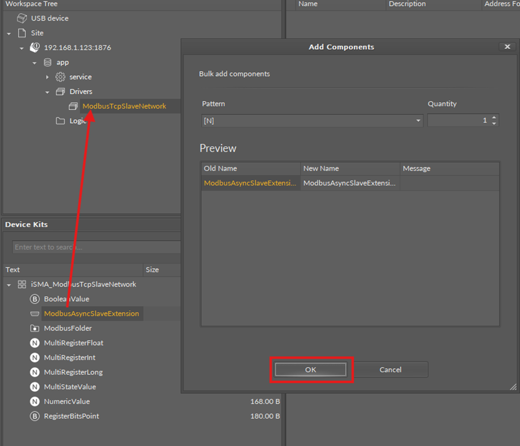 6. Klicke doppelt auf das neu hinzugefügte ModbusTcpSlaveNetwork und füge den ModbusAsyncSlaveExtension hinzu. Bestätige mit OK.